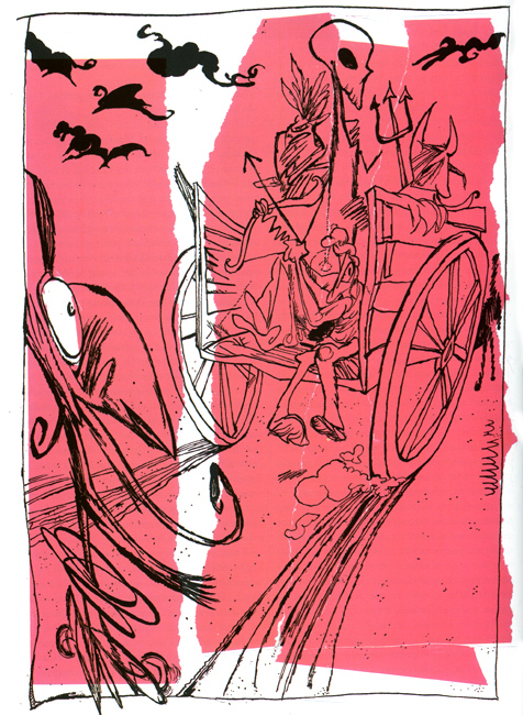 Pregunta / tarea: (A) Analice esta ilustración al enfocarse en lo que Rep subraya o enfatiza sobre don Quijote y la carreta de la Muerte. (B) Mencione tres semejanzas y tres diferencias entre la ilustración y lo que dice el texto. (C) Además, al principio de el bosquejo para este capítulo se dice que hay indicios de lo barroco en el texto. Pregunta difícil: el texto es de principios del siglo 16 español y la ilustración de Rep es de principios del siglo 21; pero los dos objetos de las humanidades son españoles salvando la enorme diferencia de época, de tipo de arte (literatura narrativa/ilustración visual) y el anacronismo, ¿en qué sentido cree Ud. que este dibujo ilustre lo «barroco» del texto? (Rep, DQ, Ed. Castalia, 2010, pág. 276) |