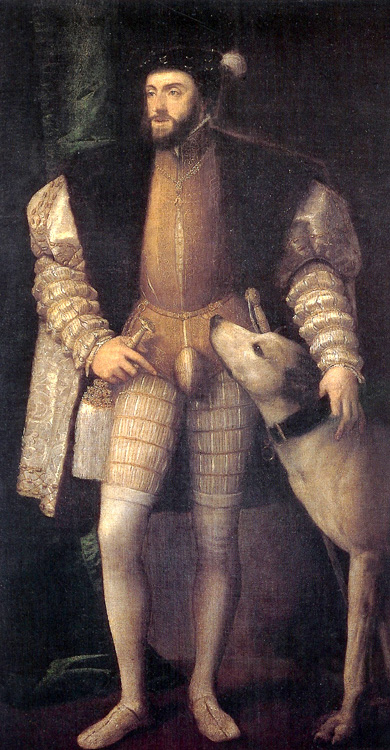 Aquí vemos al rey Carlos I (el emperador Carlos V / Karl der Funft) pintado de nuevo por Tiziano. El título es «El emperador Carlos V con perro» (óleo sobre lienzo, Museo del Prado #409). Según una norma de la estética renacentista el centro del cuadro es el punto de enfoque organizador del conjunto visual. En el centro de este cuadro se ven tres imágenes del poder: a la izquierda (en la mano derecha) el bastón regio de mando; a la derecha el perro de raza (la fidelidad cuyo hocico está cerca del centro); y en el centro el miembro viril del caballero cristiano renacentista por antonomasia.