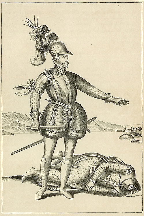 Un grabado del siglo XVI de don Juan de Austria. En esta imagen se ve al «héroe de Lepanto» matando a un turco en las riberas del norte de África. (Fuente: Sterling-Maxwell, pág. xiv, de un grabado alemán del siglo XVI.)