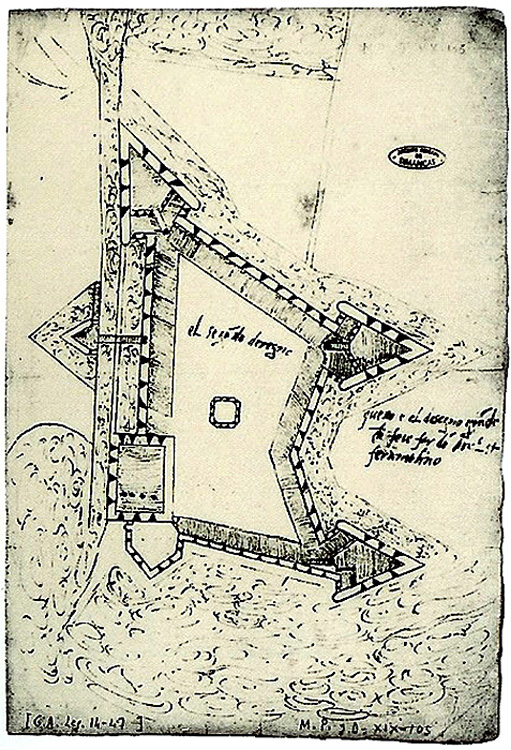 Este es el segundo diseño que se hizo del fuerte de la Goleta. En este diseño, también de 1539, se ve la primera ampliación de la fortaleza que mandó hacer Carlos V (Ferramolino, 1539; Simancas, A.G.S.).