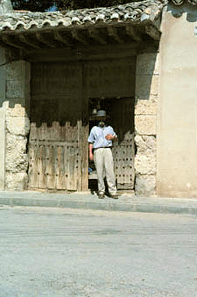 Comentarios: La entrada principal de la casa de don Quijote (los Quijada) en Esquivias. (No se sabe con seguridad que esta casa sea la casa que inspiró a Cervantes a crear el ente literario de don Quixote, pero los hinchas publicitarios de Esquivias saben que ciertos turistas van a tragar el anzuelo. ) A notar: el autorretrato de cierto "caballero profesoril" con un sombrero de cazador español; tal caballero «frisaba los cincuenta años,» y llevaba ropa auténticamente española que él se compró en El Corte Inglés de Madrid. Sin ser completamente tonto (¿cuerdo loco?), al peregrino profesoril le habría gustado la idea de imaginar que esta fuera de casa que inspiró a Cervantes...