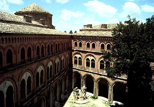 Ahora, dentro de la fortaleza, vemos el patio central con la construcción posterior a la Edad Media de este palacio de estilo neo-gótico mudéjar. De 1807 a 1812, con la invasión del ejército francés de Napoleón Bonaparte bajo su hermano José, el castillo fue utilizado como una prisón. Más tarde el castillo Belmonte pasó a manos de Eugenia de Montijo (María Eugenia Palafox Portocarrero y Kirkpatrick, condesa de Teba, 1826-1920), quien fue la emperatriz consorte de los franceses y esposa del emperador francés Napoleón III (1852-1870). Ella vivió aquí después de la muerte de su esposo en 1873. Durante su estancia en el palacio-castillo Belmonte ella hizo mucha restauración. Cuando esta foto fue sacada, no vivía nadie ni en el palacio ni en el castillo, pero había un mayordomo del complejo (véase: => #15). |