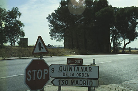 Acercándonos más a los letreros de la encrucijada vemos que estamos cerca de Quintanar de la Orden, donde hay molinos de viento, y relativamente lejos de Madrid. Para ir a El Toboso no vamos a doblar en el sentido de estos dos lugares.