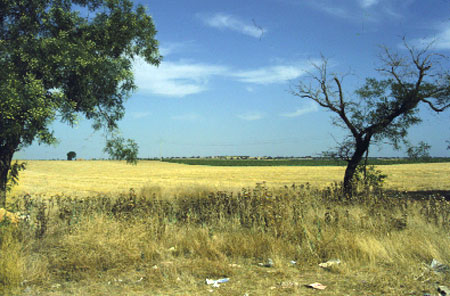Parando al lado del camino vislumbramos El Toboso a través de un campo de trigo y otro más allá de verduras.