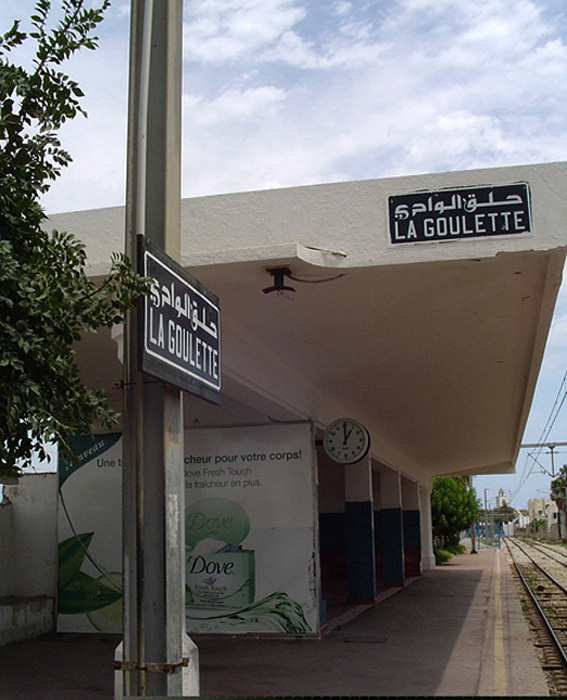 Empezamos la visita a La Goleta en la estación actual de La Goulette (francés) a 8 km. de Túnez (Tunis en francés; Tounssa en árabe), la capital de Tunicia (Tunisie o Tunisiya). El viaje de ida y vuelta cuesta muy poco. Los detalles de esta foto demustran que Tunicia es un país moderno y bilingüe. Desde esta estación vamos a ir buscando la fortaleza de la Goleta en la ciudad actual de La Goulette/Tounssa.
