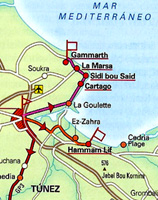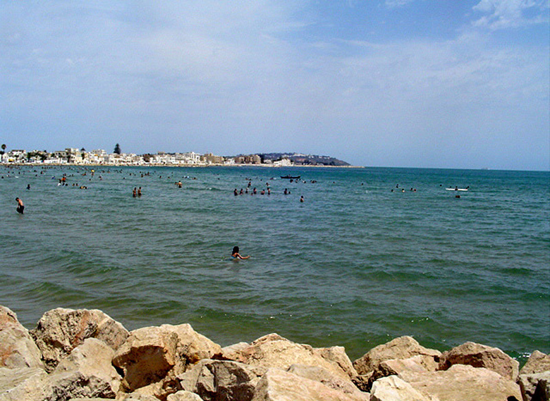 La playa de La Goulette. Vamos a ver pronto la relación de distancia actual entre la costa y la fortaleza. En el siglo XVI, claramente la fortaleza estaba al lado del agua. Hoy día La Goulette es una de las ciudades playeras para la clase media de la capital.
