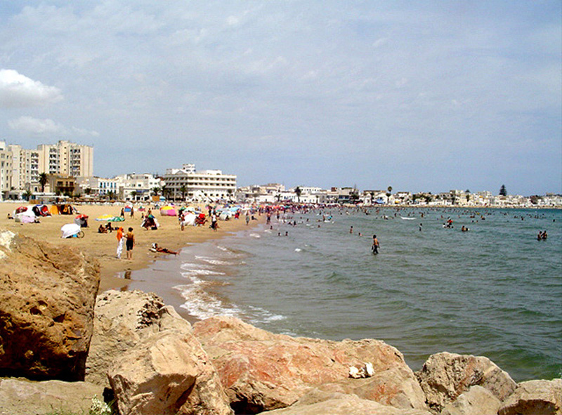 Cuando se sacó esta foto durante el verano de 2006, en esta playa había muy pocos estranjeros. La gran mayoría de la gente aquí es tunecina o árabe. En 2011, habrá menos extranjeros a causa de la "Primavera árabe" cuando Tunicia tuvo una revolución que derrocó al presidente dictatorial Ben Alí.