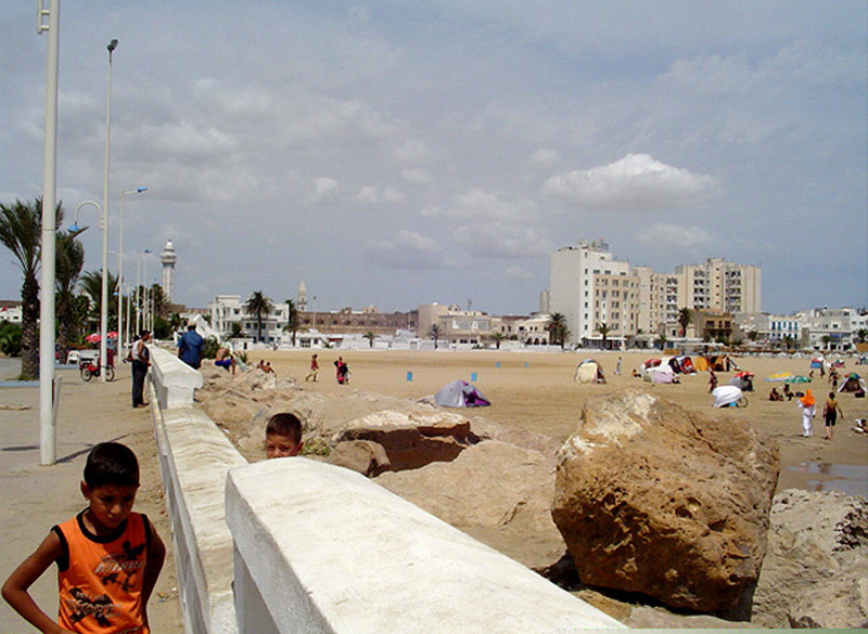 En esta imagen el fotógrafo (yo, vuestro humilde guía profesoril) da una vuelta de 90 grados a la izquierda para mirar hacia la ciudad. En primer término hay unos muchachos tunecinos algo confianzudos ante un extranjero con cámara. En el segundo término de la foto, justo en el centro, se ve la fortaleza de La Goleta. Por un lado se ve el alminar de dos mezquitas y a la derecha son varios hoteles turísticos. Otro término para la fortaleza o el fuerte es la kasba, el cual viene del árabe.