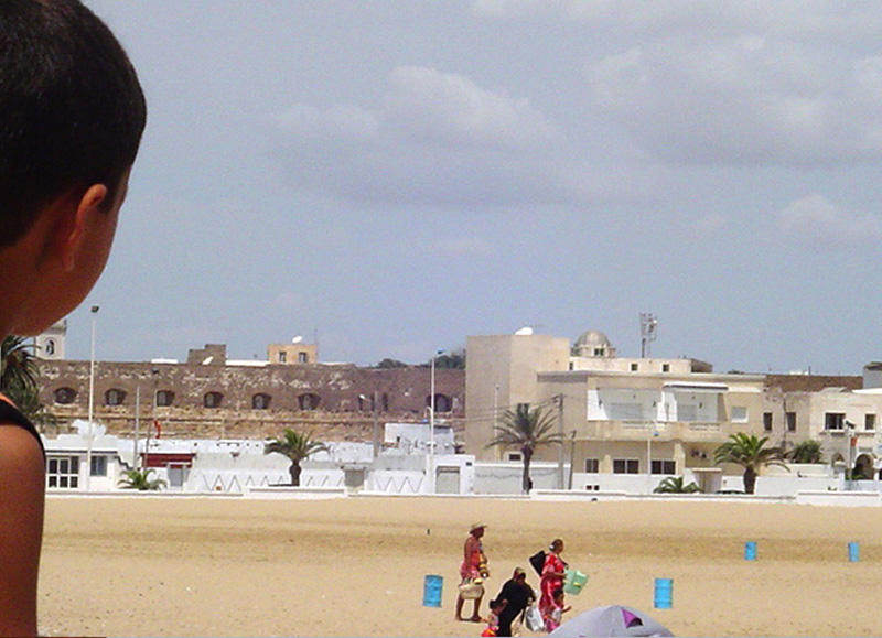 Para sacar esta foto, después de haber visto la fortaleza en la foto anterior, cambié de objetivo. En esta foto se ve con más detalle el hecho de que la fortaleza está rodeada de cerca de casas particulares. También se ve la cercanía de una mezquita por detrás y por delante, en el primer término en le marco izquierdo, el perfil de un joven tunecino.