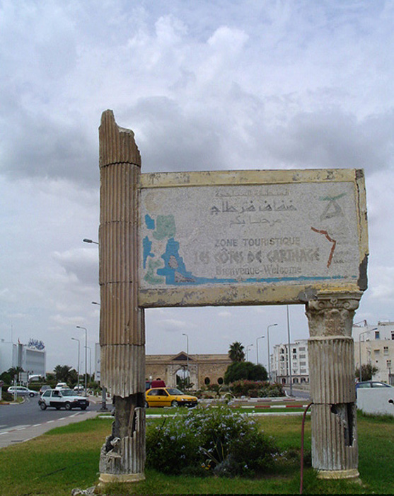 A la mano derecha de esta foto está el antiguo fuerte de La Goleta. En el centro de la avenida que corre por un lado se ve este monumento de estilo romano que anuncia el principio de la zona monumental turística de Cartago (Côtes de Carthage; o sea Costa de Cartago) tan cotizada por sus barrios elegantes, sus playas, sus hoteles de lujo y sus monumentos púnicos y romanos. Como se ve con la palabra inglesa en el cartel, hace un par de décadas los ingleses y los norteamericanos formaban un grupo muy importante de los turistas que quería atraer Tunicia. Cuando yo fui a Tunicia en 2006, había un pequeño puñado de turistas de habla inglesa.