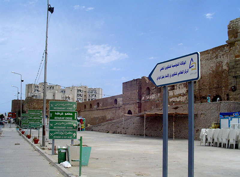 Desde el lugar de la última foto (#14) damos la vuelta a la derecha. Estamos ahora por el lado norte del edificio y caminamos, por eso hacia el este dirigiéndonos de nuevo al centro de la ciudad de La Goulette. En esta foto se ve mucha publicidad turística comercial y, a la derecha, montones de sillas portátiles que servirián para un acto cultural se realizaría dentro del monumento histórico dentro de unos días. La rampa es de construcción posterior a las épocas española y turca.