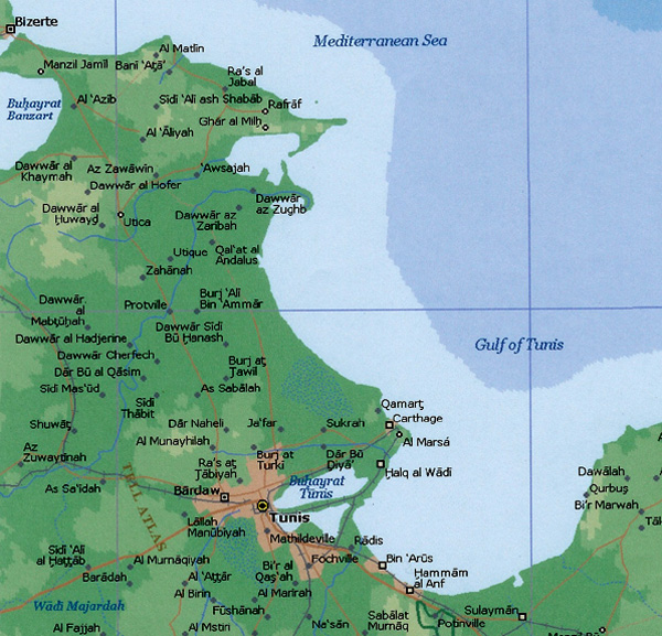 En este pedazo del mapa de Túnez se ve una ampliación de la región capitalina desde Bizerte hasta el Golfo de Túnez.