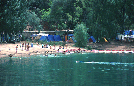Antes de subir unos kilómetros de esta séptima laguna por unas colinas por las cuales tenemos que pasar para llegas a la cueva de Montesinos vamos a para un ratito aquí. En II, 22 (pág. 573 según la edición de Juan de la Cuesta) se dice esto: «En estas y otras gustosas pláticas se les pasó aquel día, y a la noche se albergaron en una pequeña aldea, adonde el primo dijo a don Quijote que desde allí a la Cueva de Montesinos no había más de dos leguas...» Es posible que don Quixote, Sancho y el primo hayan parado aquí donde vemos unas casas cerca de esta laguna. Sin embargo, para mí este balneario es mucho más moderno que el pueblo mismo de Ruidera. Por eso creo que la «pequeña aldea» es más bien el pueblo que está cerca del cementerio y del primer lago.