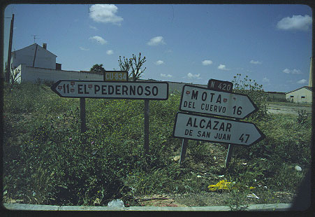 En una encrucijada moderna se ven unos letreros que indican ciertos caminos y tres pueblos manchegos.