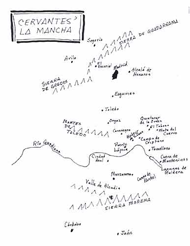 Varios lugares claves de La Mancha cervantina y quijotesca entre las sierras de Gredos y de Guadarrama al norte y la Sierra Morena al sur