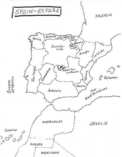 España con los países vecinos y las 17 comunidades autónomas actuales