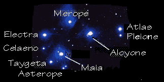 colocado en el cielo detrás de las Pléyades, inmortalizando