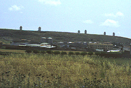 Una vista de los molinos de viento mirando desde abajo en el pueblo de Campo de Criptana.