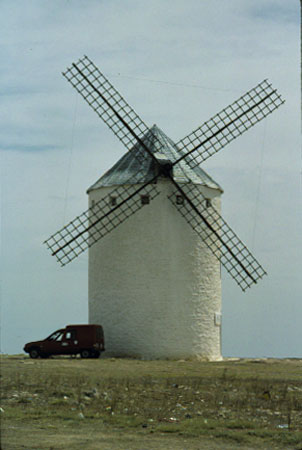 Un gigantesco molino acompañado en su soledad por una furgoneta típica de España.