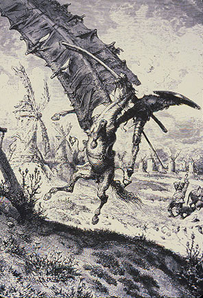 Esta foto es el modo en que el artista francés Doré imaginó en el siglo XIX la aventura de los molinos de viento.