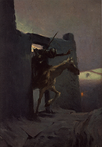 Esta ilustración de José Segrelles se halla en la edición norteamericana de Barnes & Noble (1999, pág. 36) con traducción de J. M. Cohen e introducción de Carlos Fuentes. La cita que ilustra es esta: "One morning before dawn...he armed himself completely, mounted Rocinante, put on his badly mended head-piece, slung on his shield, seized his lance and went out into the plain through the back gate of his yard..." (Cap. I, 2; pág. 23).
