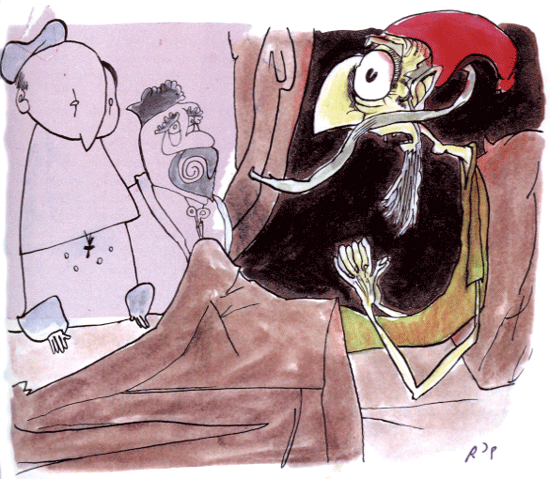 - En esta ilustración de Miguel Rep (Editorial Castalia, 2010, pág. 397), hay una dinánica caricatura de los tres personajes presentes en el coloquio que tiene lugar al lado de la cama de don Quiijote. (A) Describa, por favor, lo que Rep nos comunica acerca de su visión de los tres personajes y (B) refiriéndose al texto, analice la medida en que Rep, en su opinión representa bien (o mal) lo que le comunica el texto de la obra misma.