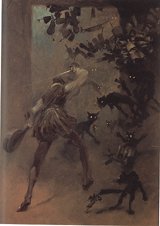a los gatos que andaban por el aposento, les tiró muchas cuchilladas.»