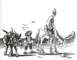 de los protagonistas al lugar de la derrota de don Quixote. El dibujo es de