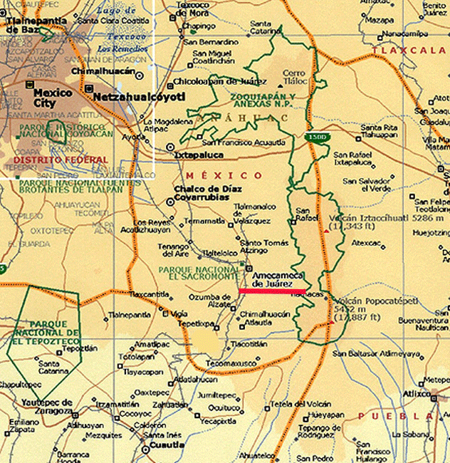 Image: Panoayán is located at the left end of the red underline below the city of Amecameca in the lower center of the map. Notice that the state of Puebla is to the lower right (SE), Mexico City (D.F.) is to the upper left (NW), the town of Tepoztlán and the Tepozteco pyramid are to the left (W), and the 17,887 foot Popocatépetl (don Gregorio or don Goyo) volcano is just to the right (E). Juana Inés Asbaje y Ramírez was born in San Miguel Nepantla, which is a small town south on the highway roughly half way between Amecameca and Cuautla. |