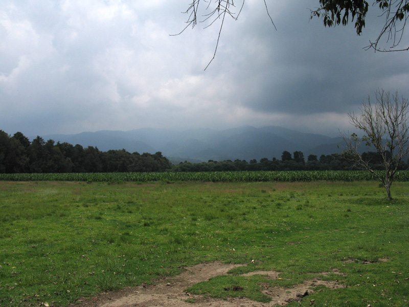Source: Photographs by WTL© (2009) on site at Panoayán. Image: Here you see the agricultural fields attached to the Panoayán hacienda, which Juana Inés's grandfather rented. Additional images: For an outdoor model on the property of the amusement park representing the famous and legendary twin volcanos to the east of Panoayán and seen here hidden in the clouds in the background of this image twin volcanos, see: => Panoayán #6a and beyond. |