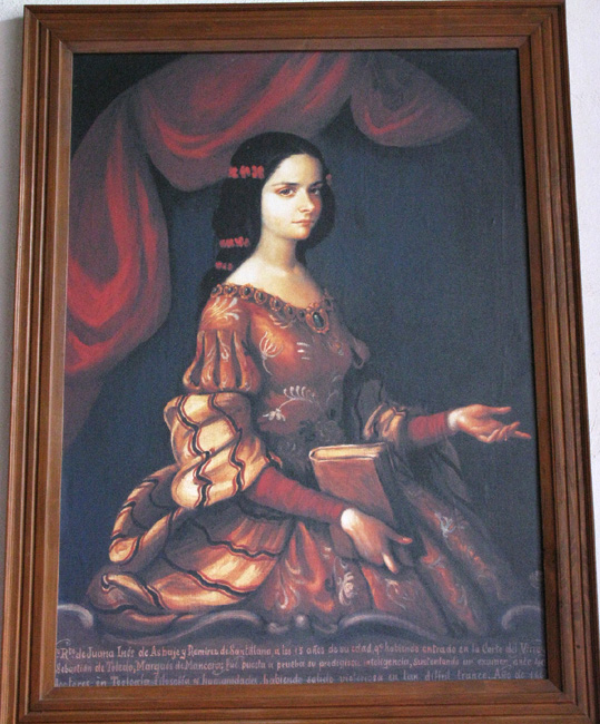 Source: Photograph by WTL© (2009) on site at Panoayán. Image: In one of the patio's outdoor corridors, the museum's curators have hung this canvas. It is a 20th century painting by Jorge Sánchez depicting Juana Inés at fifteen years old. Humanities questions: What style does Sánchez use to create this painting? From what you know about Sor Juana and her life, do you think this painting depicts here with any degree of plausible accuracy? |