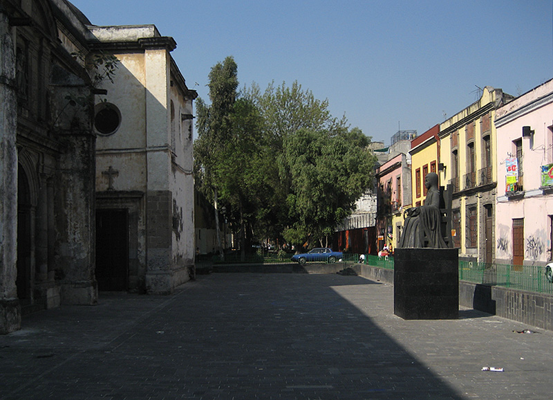 Source: WTL digital photograph on site in Mexico City, D.F. Image: On what is now the back side of the university, here we see, on the left, what was originally the convent's main entrance, and, on the right, buildings in the downtown residential neighborhood where the convent-university is located. A large modern statue of Sor Juana is facing the original entrance to the chapel and the convent. |