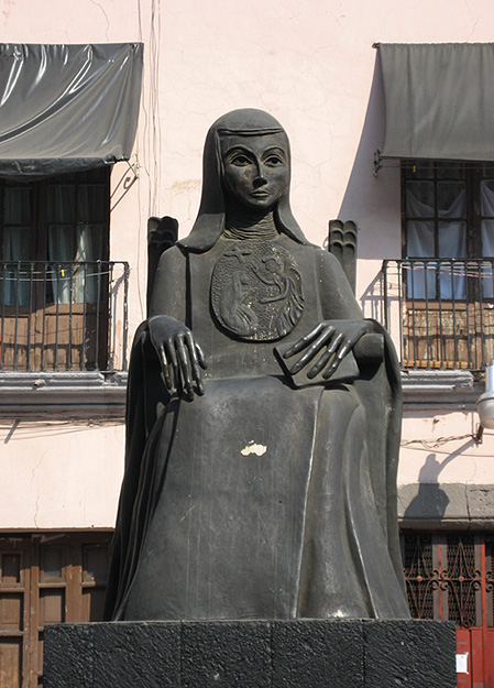 Source: WTL digital photograph on site in Mexico City, D.F. Image: Modern bronze statue of Sor Juana Inés de la Cruz situated facing the original entrance to the chapel and Hieronymite convent of Santa Paula. Humanities questions: Knowing this is neither a Renaissance statue nor a Baroque statue, how would you describe the style you see? How does the background in this photograph affect your interpretation of the statue? What objects has the sculptor including in his work that add to what he/she is communicating about Sor Juana? |