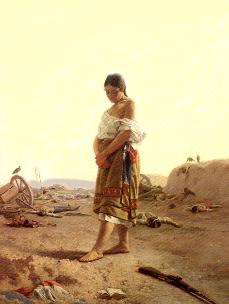 Source: Dawn Ades, Art in Latin America. New Haven: Yale University Press, 1989, p. 28. Image: "Paraguay: Image of Your Desolate Country," Juan Manuel Blanes, c. 1880. Oil on canvas in the Museo Nacional de Artes Plásticas, Montevideo, Uruguay. Comments: What is depicted in this canvas is the death and devastation in Paraguay that occured during the War of the Triple Alliance (or the Paraguayan War, 1864-1870). It was perhaps the bloodiest war in the history of South America. The warring countries were Paraguay vs. Argentina, Brazil, and Uruguay. A half million people were killed during the war. Humanities questions: Identify the painting's style. What elements does the painter use to characterize the idea of this specific Paraguayan historical reality. What does the central figure communicate? |