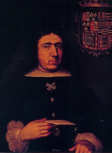 Source: Margo Glanz, Sor Juana Inés de la Cruz; saberes y placeres. Toluca, México: Instituto Mexiquense de Cultura, 1996, p. 40. Portrait: Anonymous. "Don Tomás de la Cerda Manrique de Lara, conde de Paredes, marqués de la Laguna." Oil on canvas, 17th century. Comments: Identify the major images and elements in this painting. What is this painting communicating? What are the elements in this portrait that tell us it is a baroque painting? |