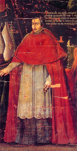 Source: Margo Glanz, Sor Juana Inés de la Cruz; saberes y placeres. Toluca, México: Instituto Mexiquense de Cultura, 1996, p. 42. Image: Anonymous, oil on canvas, 18th century. This full-length portrait of the Bishop of Puebla, Fr. Manuel Fernández de Santa Cruz is in bad repair. Huamnities questions: (A) Identify five significant images and elements in this painting: analyze them, and evaluate them in their separate parts and as parts of a whole. (B) What is this painting communicating? Correlate your ideas with the fact that he used the pseudonym Sor Filotea de la Cruz when he wrote to Sor Juana. |
