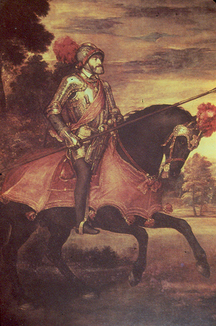 Image: This painting (1548) of Carlos V of Hapsburg is by Titian (Titiano, 1485-1576). The title is "Emperor Carlos V at Mühlberg". Comment: The painting's style is from the height of the Italian Renaissance. Titian was engaged by Carlos V and Felipe II as official court painter in Madrid. Question: What is the painter communicating to us about his subject? |