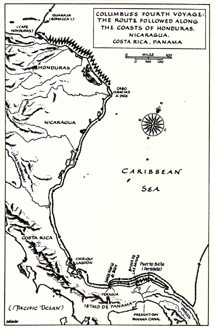 Image: This drawing depicts a good estimate of Columbus's fourth voyage, this one along the coast of Central America from Panamá to Honduras.