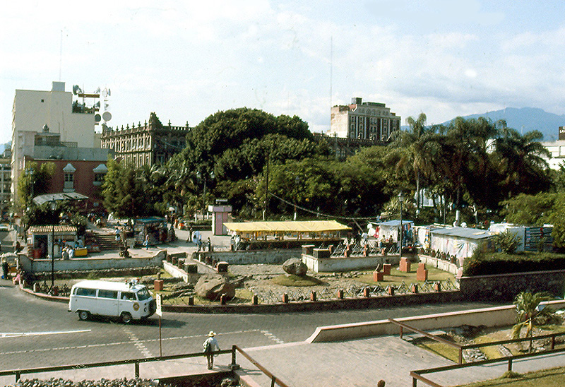 Source: WTL photo© taken on site in Cuernavaca. Image: This is the old central square (el zócalo) in the city's historical district (centro histórico). The view is from the second floor (la primera planta) of the Palacio de Cortés, which you will see in Cortés #6. The photo is shot from the east side of the square. Across the square you see the Palacio de Gobierno (government building). Comments: In this very old conquest-period colonial city, Cortés's palace (the power center) was built on the Spanish urban plan city square, whereas the church (la cathedral)—which you will see in Cortés # 13, #14, #15—was built a few blocks away. This is the only city in Mexico in which there is not a religious building on the zócalo or plaza mayor. In the central square you see ruins, artisans' booths, and the usual groomed park, all vying for space and attention. The park is called the Jardín Juárez for the 19th century president who defeated the French. Around the gazebo in the park are mariachi bands playing Mexican traditional music especially in the evening. Embedded Images: For a few more views of downtown Cuernavaca, see: => Cuernavaca, 5a; => Cuernavaca, 5b; => Cuernavaca, 5c; => Cuernavaca, 5d. => Cuernavaca, 5e; and => Cuernavaca, 5f. |