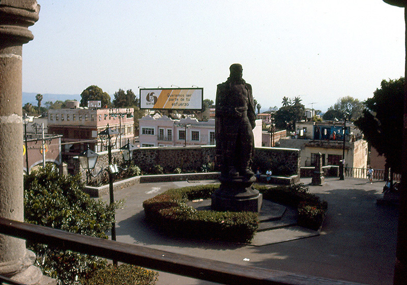 Image: The view is from the Palacio de Cortés looking directly at the giant statue in the center of the Plaza de Armas (English: Place d'Armes), which adjoins the Jardín Juárez.
