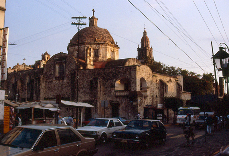 Source: WTL photo© taken on site in Cuernavaca. Image: On the street corner (Avenida Morelos closest, Avenida Hidalgo to the left), you see the Cathedral's old chapel and the site of a still functioning Franciscan convent. Comments: One of the unique and most popular aspects of this cathedral are the mariachi masses at 11:00 a.m. Down the street off of the sidewalk on the right is the Jardín Borda, which you will see in Cuernavaca #16 and #17. The Franciscan order still maintains a convent on this corner. |