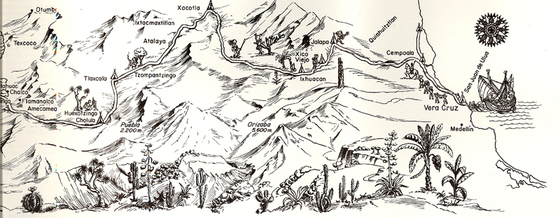 Source: WTL course files Map: Cortés and his forces land at San Juan de Ulúa on the Gulf of Mexico at the right. They found the government of the future city of Veracruz (Villa Rica de la Vera Cruz / Rich City of the True Cross). Then they march west through the mountains to Lake Texcoco on the far left side of the map. The Aztec capital is on an island in Lake Texcoco. |