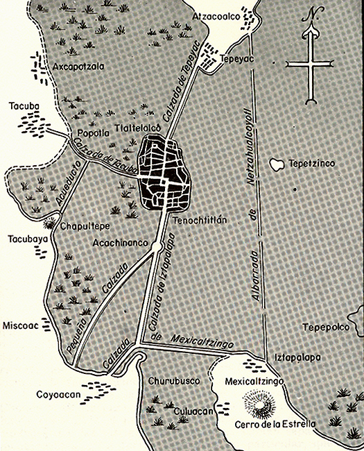 Source: WTL course files Map: The checkered medium dark shaded area is Lake Texcoco. The darkest are in the lake is Tenochtitlán. Things to notice: (1) the causeways (calzadas) linking then mainland to the island; (2) the square in the center of the main island, which is the area of the Great Pyramid; (3) just to the north of the Great Pyramid is another, smaller, square: this is the important Plaza de Tlatelolco; (4) at the north end of the Calzada de Tepeyac is the village of Tepeyac, important for the Virgen de Guadalupe miracle story; (5) at the end of Calzada de Tacuba and the Acueducto is the hill of Chapultepec, which is where Moctezuma's palace was, where la Malinche/Doña Marina lived; and where the Parque de Chapultepec and the Museo Nacional de Antropología are nowadays; and (6) at the bottom left, where the Calzada de Mexicaltzingo starts, is Coyaocán, which is the modern suburb of Mexico City where Frida Kahlo lived. |