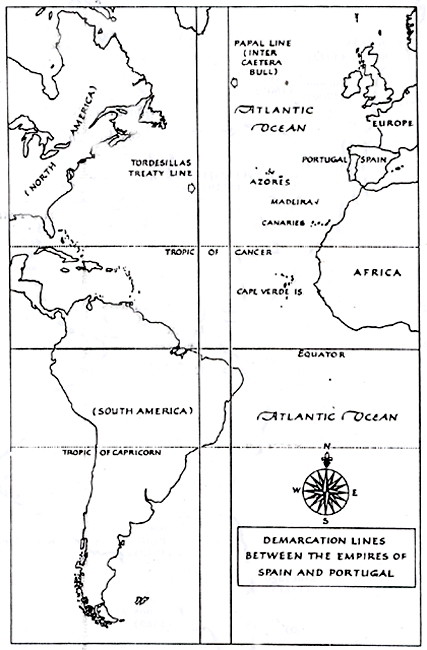 Notes: This map is not drawn to scale, but rather the Western Hemisphere has been pushed closer to Africa and Europe in order to show roughly where the two lines of demarcation cut across the tip of South America. Also, notice significantly that the pope gave no other European country any legal or papal "right" to colonize the Americas. France, first, and England, later, would dispute the legal language of the pope's bull "Inter Caetera".