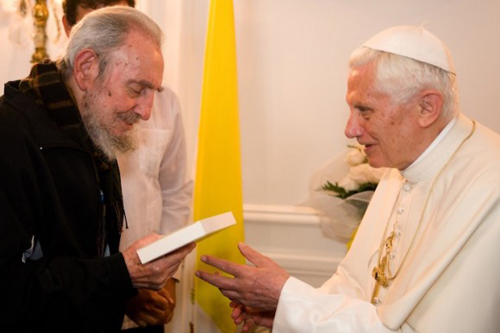 SOSTIENEN ENCUENTRO FIDEL Y EL PAPA BENEDICTO XVI Poco después de concluida la multitudinaria misa que ofició en la Plaza de la Revolución, el Papa Benedicto XVI recibió en la Nunciatura Apostólica en La Habana al líder histórico de la Revolución Cubana Fidel Castro Ruz. Fidel llegó a las 12 y 20 pm a la sede de la Nunciatura y allí lo acogió el cardenal Tarcisio Bertone, Secretario de Estado de la Santa Sede, con quien se había encontrado anteriormente en Cuba cuando el segundo en la jerarquía vaticana visitó nuestro país. Durante el encuentro con el Papa, que se extendió por media hora, Fidel le explicó al sumo pontífice que había seguido todos los acontecimientos de su viaje a nuestro país a través de la televisión cubana y se interesó por detalles de la liturgia de la Iglesia Católica. El Papa Benedicto XVI agradeció las muestras de cariño que había recibido en Cuba y le explicó sobre el sentido de sus viajes por el mundo para confirmar en la fe a los cristianos, así como el servicio de la iglesia a los pueblos. Ambas personalidades intercambiaron animadamente sobre temas ecológicos, culturales, científicos, religiosos y sobre los graves problemas que aquejan a la humanidad. Fidel solicitó al Papa que le envíe algunos libros sobre esos temas que tanto le interesan. En conferencia de prensa en La Habana, el vocero del Vaticano Federico Lombardi, aseguró que el encuentro entre el líder de la Revolución cubana Fidel Castro y el Papa Benedicto XVI fue “muy cordial” y resaltó el buen ánimo y la jocosidad de ambos. |