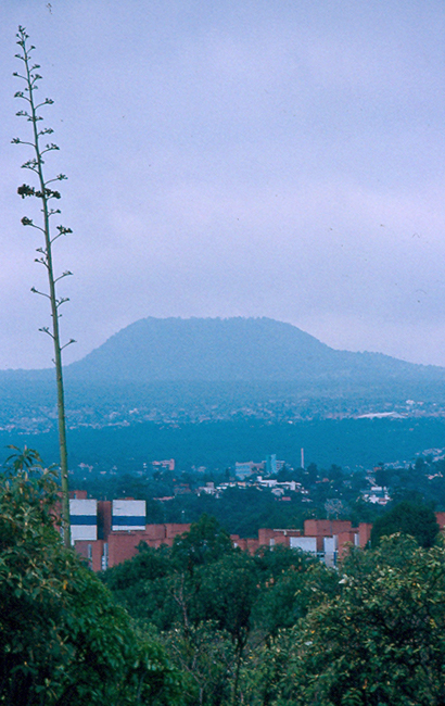 Notes: This photo gives you a small idea of the physical context in which the Cuicuilco pyramid is located. Here we are looking north from the parking lot next to the site. The name "Cuicuilco" means "place of song and dance" and/or "the place of many colors". The mountain in the background is the Xitle volcano, whose eruption caused the inhabitants of Cuicuilco to leave the area around 100 BCE. From here the survivors went north, past the Valley of Anáhuac (Tenochtitlan had not yet been settled by the Aztecs) to a valley where the survivors of the Xitle eruption founded Teotihuacan.