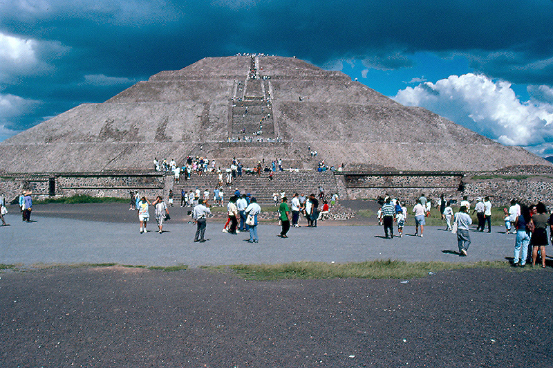Comments: Here you see the Pyramid of the Sun (la pirámide del sol), the largest of Teotihuacan's pyramids. The second-largest pyramid at Teotihuacan is the Pyramid of the Moon. As a point of comparison, the Great Pyramid of Egypt is about twice the size of this pyramid, yet the Sun Pyramid is still huge. It is made of earth and adobe bricks, and it is covered with gravel and stone. When it was finished and in use it was covered with brightly painted (polychrome) stucco. This pyramid is 213 ft high (about 70 m). The sun, at its zenith, stands squarely in front of its main façade, which you see here.