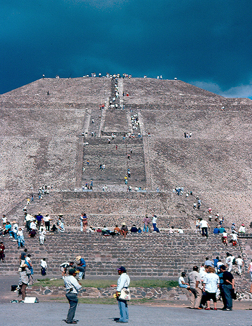 Comments: Now we stand before it in awe (admiratio), which is the idea and emotion it was built to inspire and which successive peoples have felt in its presence: teotihuacanos, toltecas, mexica, Spaniards, Mexicans, modern tourists. Originally (first finished phase), the Sun Pyramid had four levels. Later, it was reconstructed with a fifth level, which, I think, you can see here. (The steps at the bottom are not one of the pyramid's (sacred) levels.