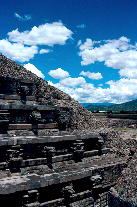 Notes: On another side of the same temple, under a dramatic and beautiful summer sky in the central Mexican highlands, we see alternating sculptures of Quetzalcóatl and Tláloc. Remember that the sculptures we see on the side of this pyramid were discovered and covered in the 20th century after Teotihuacan was abandoned and then being gradually covered and buried for nearly a thousand years of accumulated sand, dirt, dust, and neglect so that now we can see some aspect of what this pyramid looked like when it was functioning as a religious site in a population of about 200,000 people.