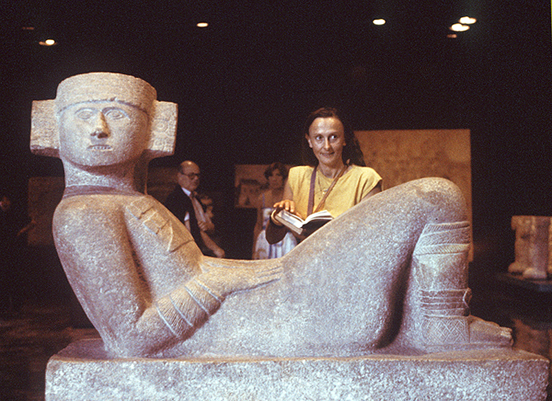 Comments: This is a photo of a Chac-Mool in the Sala Azteca. (Originally, this stone statue was at the entrance to the Aztec room, but now it has been moved to one side. Ask to see Dr. Little's tourist souvenir Chac Mool in class.) Chac-Mool (sic) is the name of this style of stone statue, exemplars of which have been found in archeological sites of the Toltecs and other sites conquered by the Toltecs, first, and by the Aztecs later, sites such as Chichén Itzá in the Yucatán. There is no definitive interpretation of this statue; however, a traditional interpretation says that a recepticle was placed on the reclining figure's stomach, the purpose of which was to hold a sacrificed human heart. (Do not confuse a Chac-Mool with Chaac, the Mayan god of rain.)